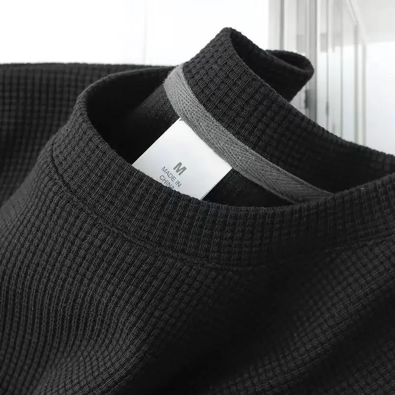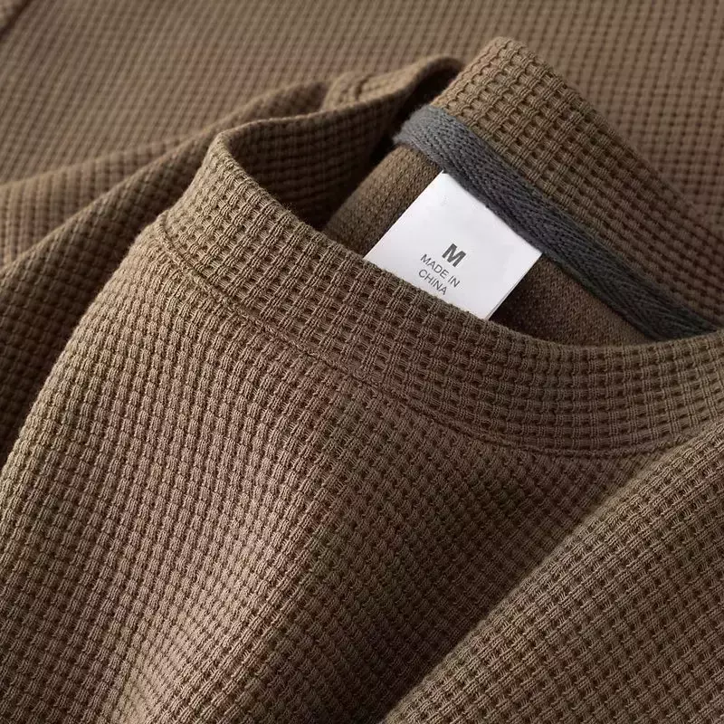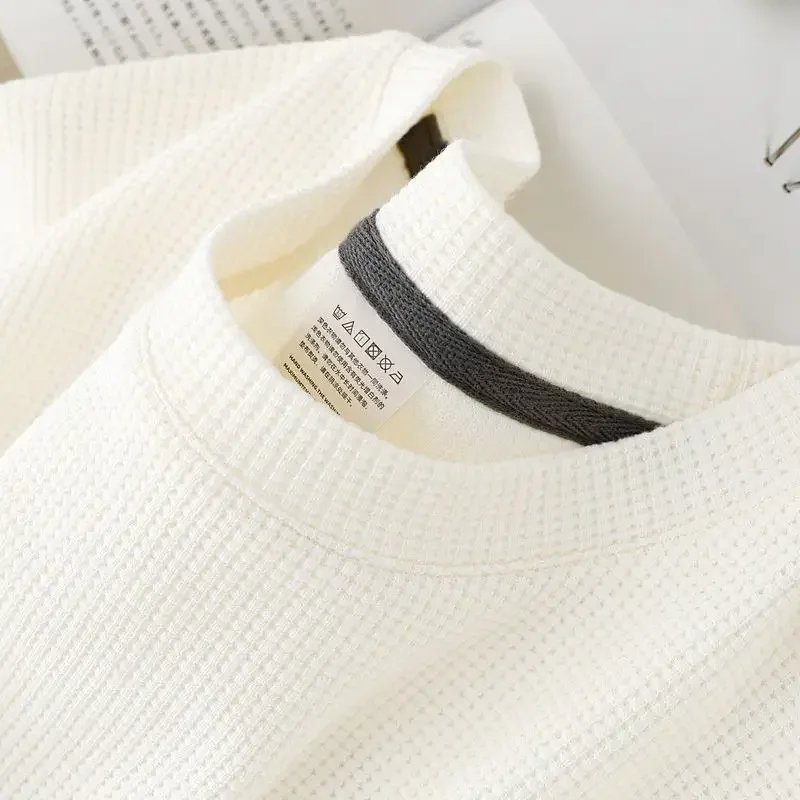 Toque premium: textura waffle que eleva o padrão de uma camiseta básica, tornando-a sofisticada sem esforço.
